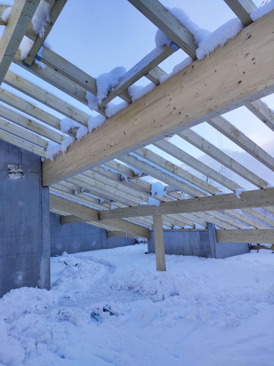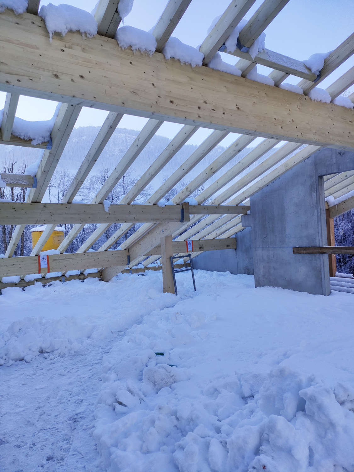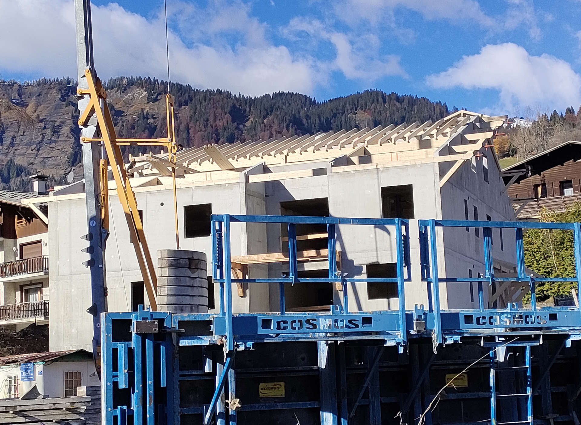 Notre charpentier LPS à Scionzier, œuvre à la concrétisation de ce nouveau projet malgré la neige qui est déjà arrivée en abondance.
